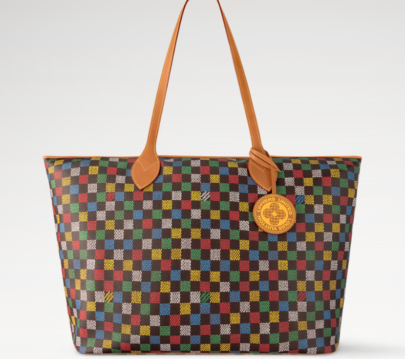The Nevereverfull bg is an XL format carryall bag made from LVers Damier Ebene coated canvas, Pharrell Williams’ multicoloured reimagining of the original Damier Ebene's black and brown colourway. Ultra-practical, the lightweight Nevereverfull closes with pearl zip pulls, keeping belongings secure. There is a removable leather pouch inside. It is signed with a removable LVERS UNITED tag.